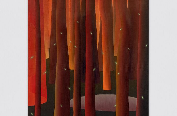 Nas pinturas apresentadas, Rafael Chavez rompe com a noção clássica da tela como janela para o mundo. Em vez de organizar o espaço a partir de uma perspectiva estável, suas imagens sugerem interiores, cavidades e campos que se confundem com o horizonte. O olhar não se posiciona diante da paisagem, mas se projeta dentro dela. Muitas das obras possuem orientação vertical e se impõem como estruturas tensionadas, evocando troncos, colunas ou eixos que conectam o chão ao céu, o humano ao cósmico.