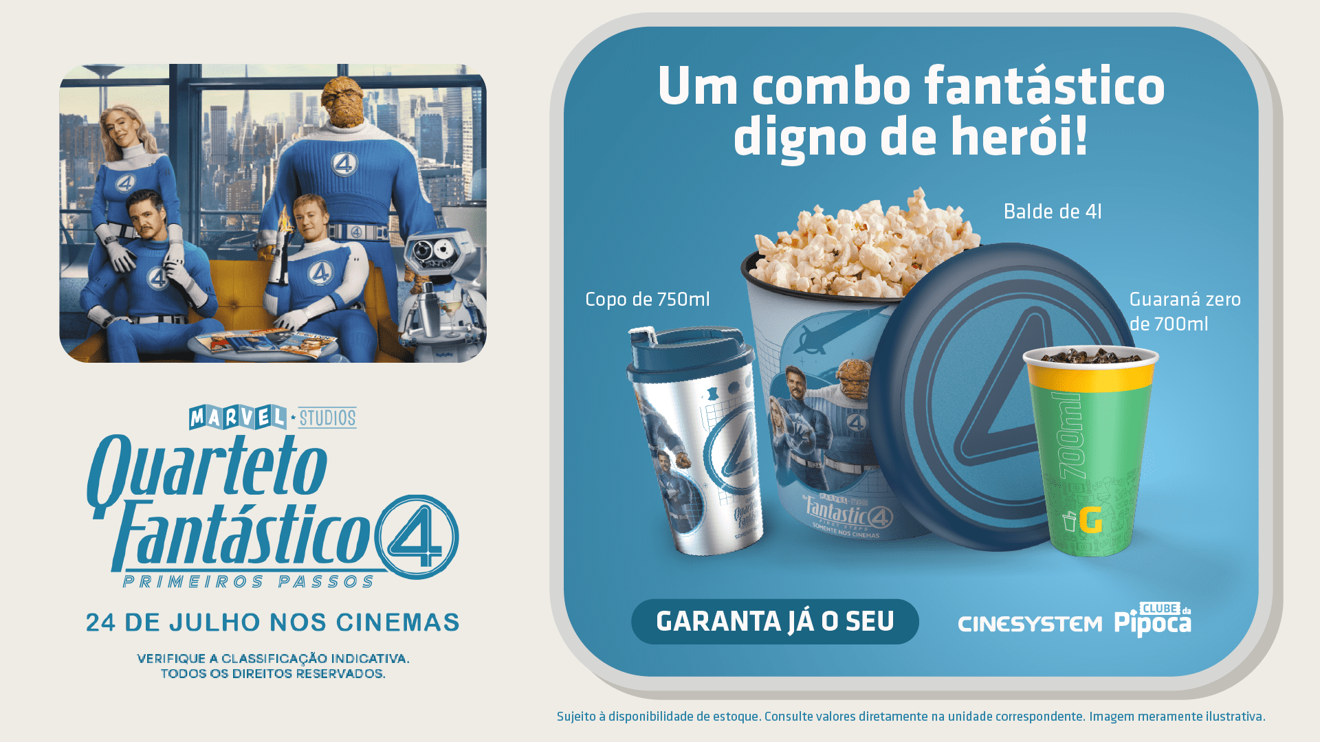 Os produtos fazem parte de um combo especial disponível nas bombonieres da rede Cinesystem. Ao adquirir sua pipoca e refrigerante, o cliente pode incluir um copo de 700ml estilizado com arte exclusiva do filme — que já virou objeto de desejo entre fãs e colecionadores. Cada peça foi desenvolvida para destacar os quatro protagonistas: o Sr. Fantástico, a Mulher Invisível, o Tocha Humana e o Coisa, todos com visual retrô-futurista alinhado ao tom artístico do longa.
